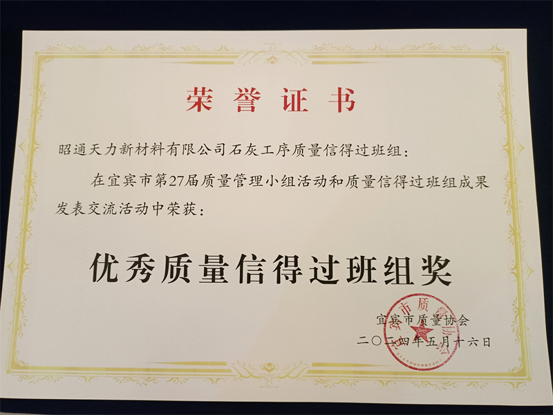 天力新材料“石灰工序質(zhì)量信得過班組”榮獲“優(yōu)秀質(zhì)量信得過班組”
