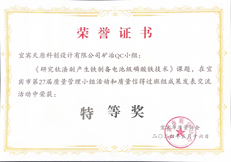 科創(chuàng)設(shè)計(jì)公司“研究鈦渣副產(chǎn)生鐵制備電池級磷酸鐵技術(shù)”課題榮獲QC成果“特等獎(jiǎng)”